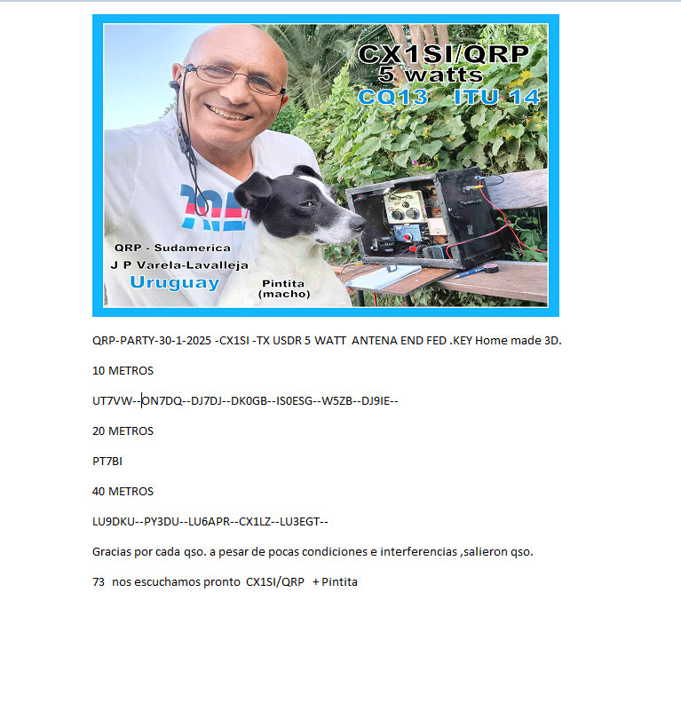 Ayer por la tarde tuve el placer de participar en la primera FIESTA QRP del año 2025, pero las condiciones fueron pésimas, sobre todo mi recepción se vio muy interferida por todo lo sucio eléctrico. Aún así tuve un gran QSO con CX1SI y su recepción sensible y limpia, luego tuve otro QSO rápido con ZP5DPA.